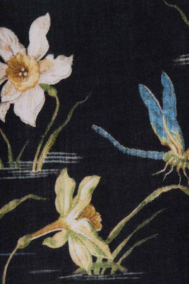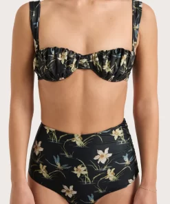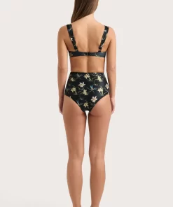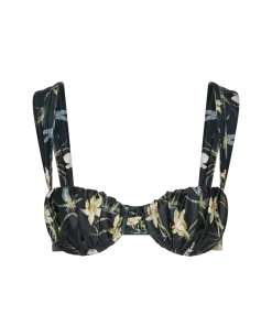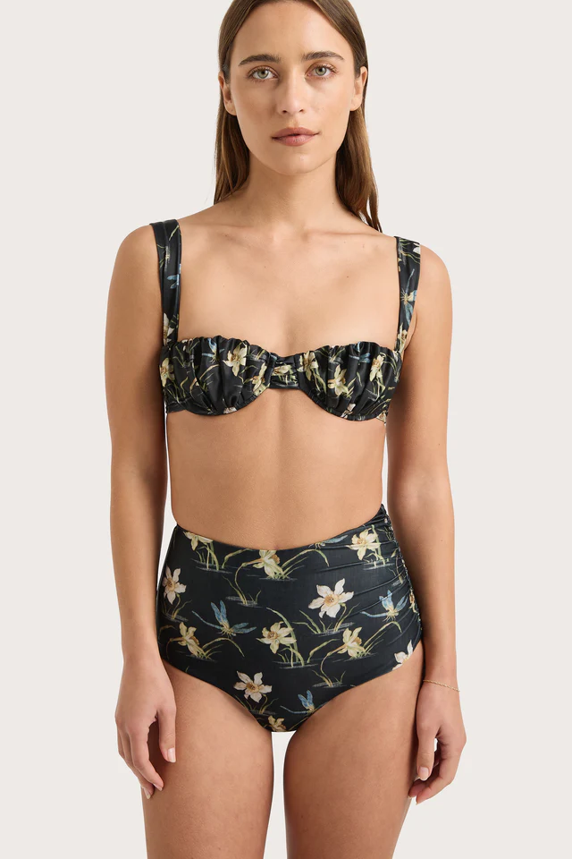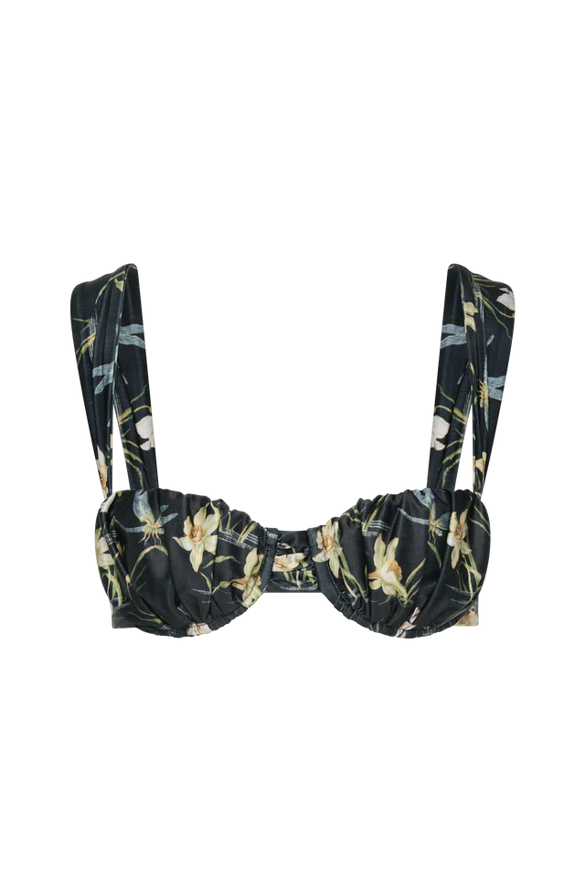 A balconette-style bikini top with wide straps, adjustable in length. Designed in a vintage-inspired black and yellow daffodil print, it is lined through the front and offers pleat detailing for a feminine approach. Style with the matching Bianca Bikini Bottom. This style is true to size and offers medium coverage. Adjustable straps allow for a custom fit, however please note it is fixed through the back with a clasp fixture.