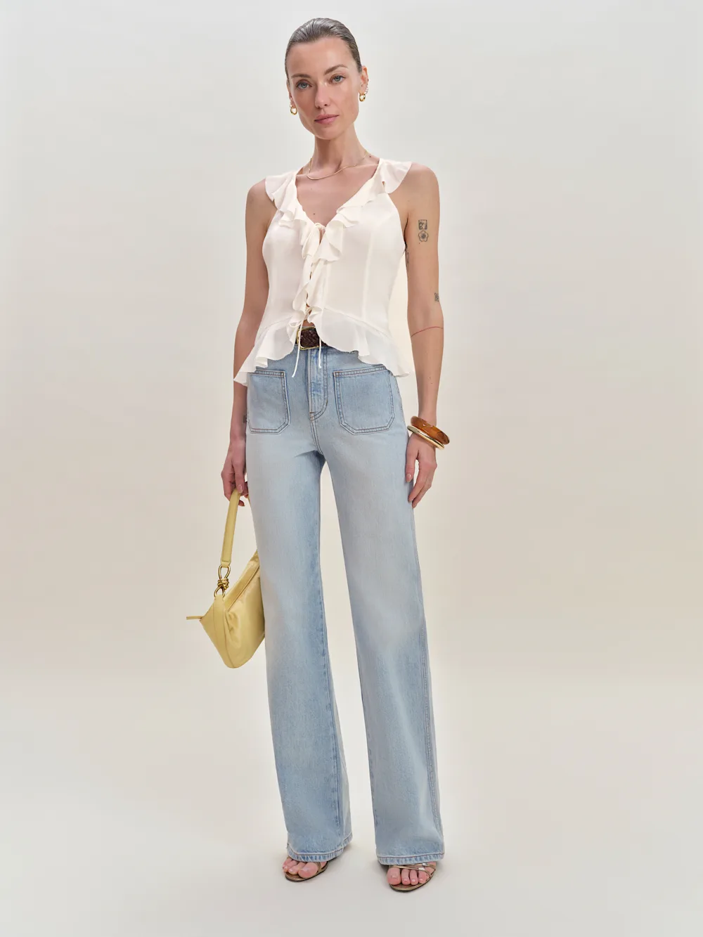Designed to be fitted at the waist and hips with a wide leg.