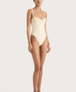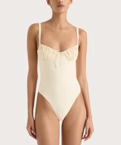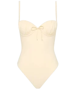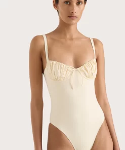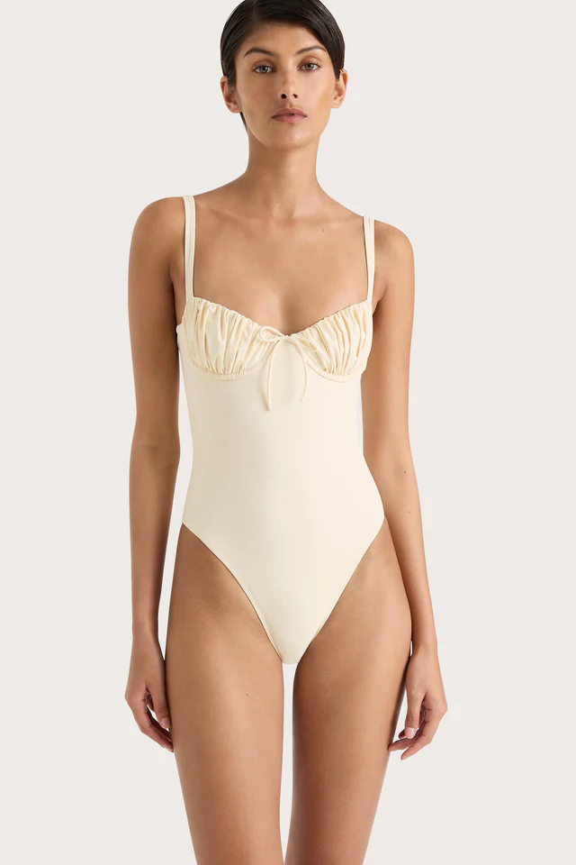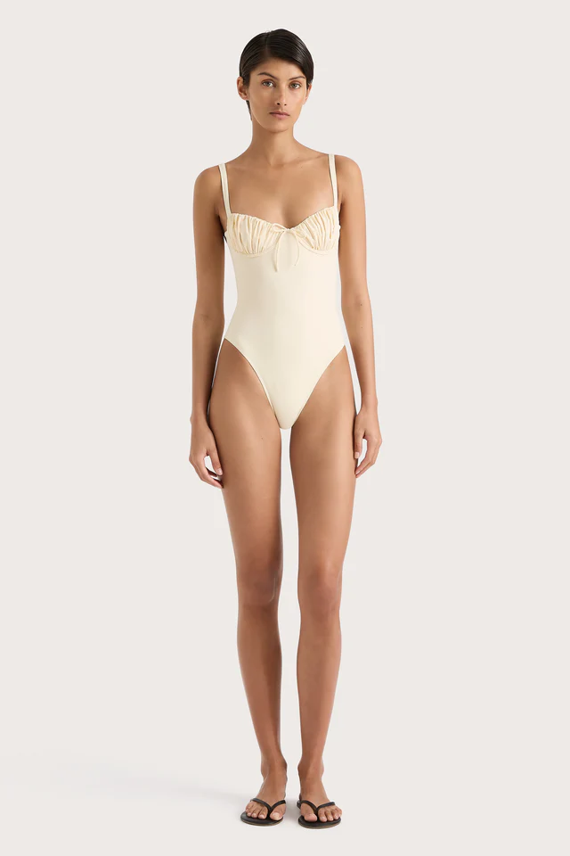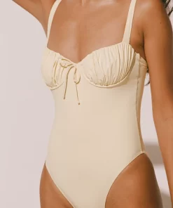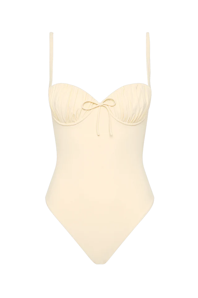 A timeless one-piece swimsuit with a flattering silhouette in a soft buttery yellow. It features balconette-style cups at the bust with gathering and pleats as well as a bow detail. With thin straps, adjustable in length, it is fitted through the body and cuts in at the hips.This style is true to size. Adjustable straps allow for a custom fit and the fabrication offers stretch.