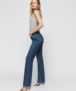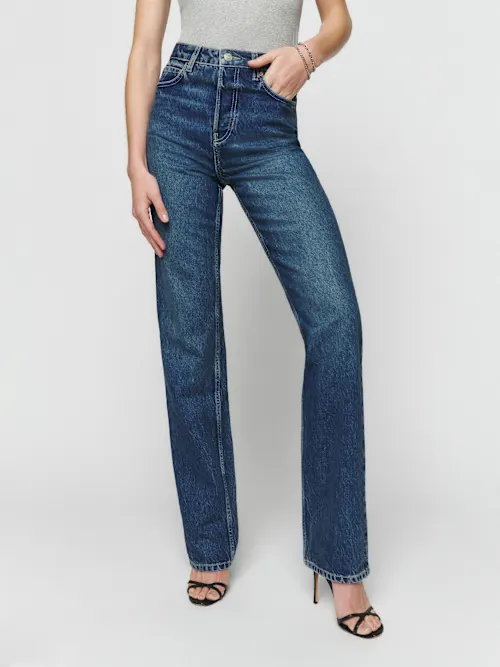 Designed to be fitted through the waist, hips, and thigh with a straight leg.