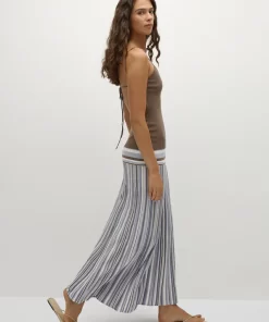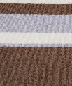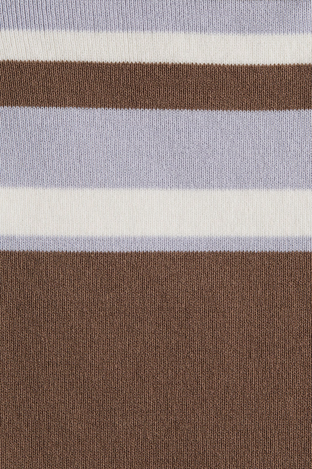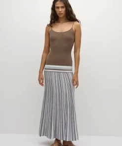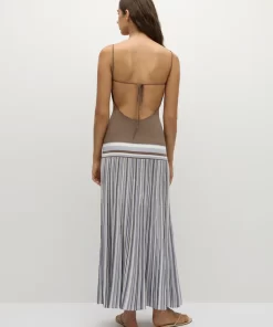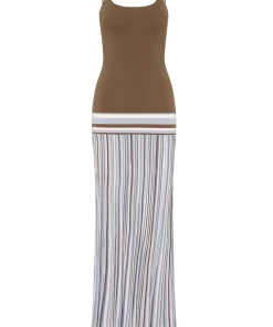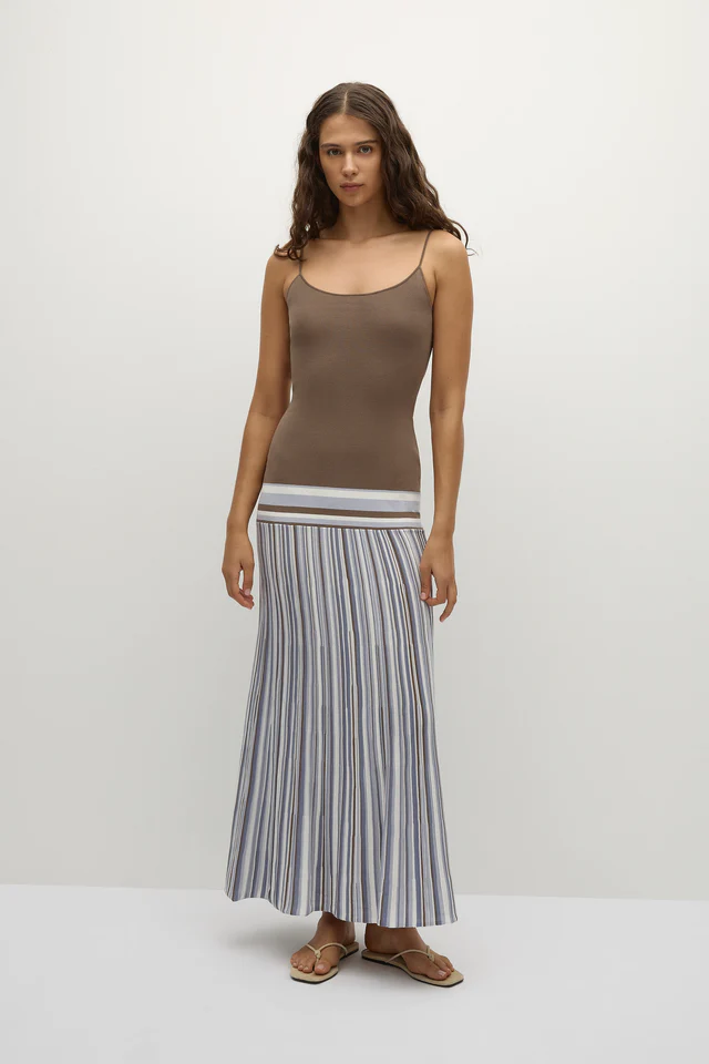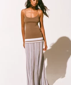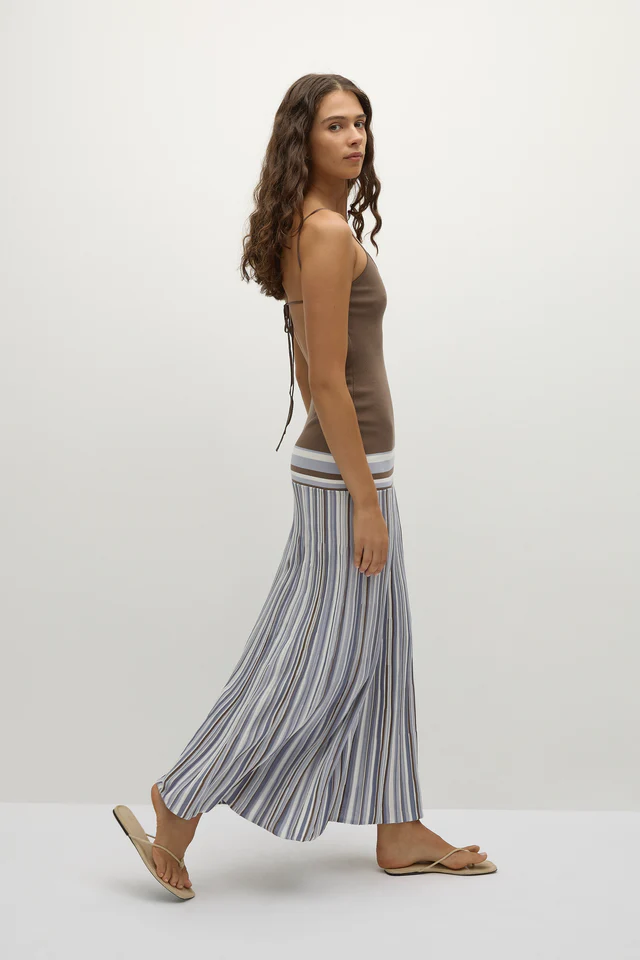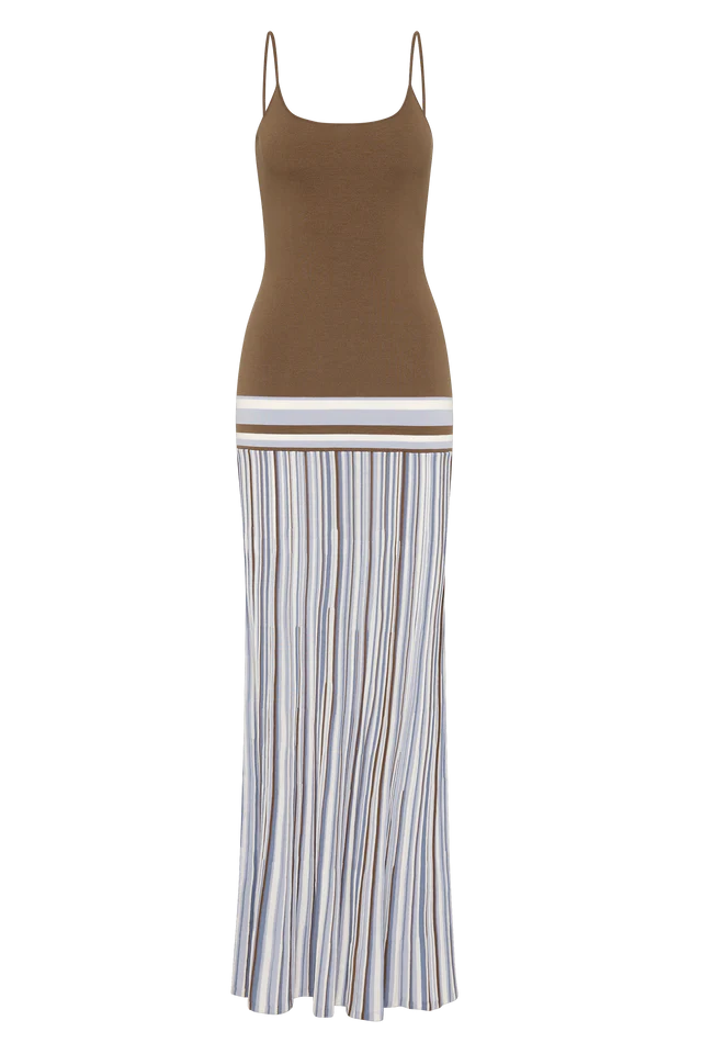 A beloved FAITHFULL style in a warm cocoa brown and soft blue signature stripe. It features a rounded scoop neckline with thin straps, adjustable in length. It is fitted through the body before falling into a drop waist silhouette with a lightly flared skirt. The bodice is backless with a delicate tie detail. Designed from a unique and ribbed true knitwear fabrication, blending 100% organic cotton and nylon, it is both lightweight and the perfect summer occasionwear piece. This style is true to size. Please note as it is a nylon blend there is some stretch through the fabric. It is recommended to style over neutral intimates.