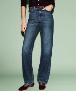 Designed to be fitted throughout waist, hips, and thighs, with a wide leg.