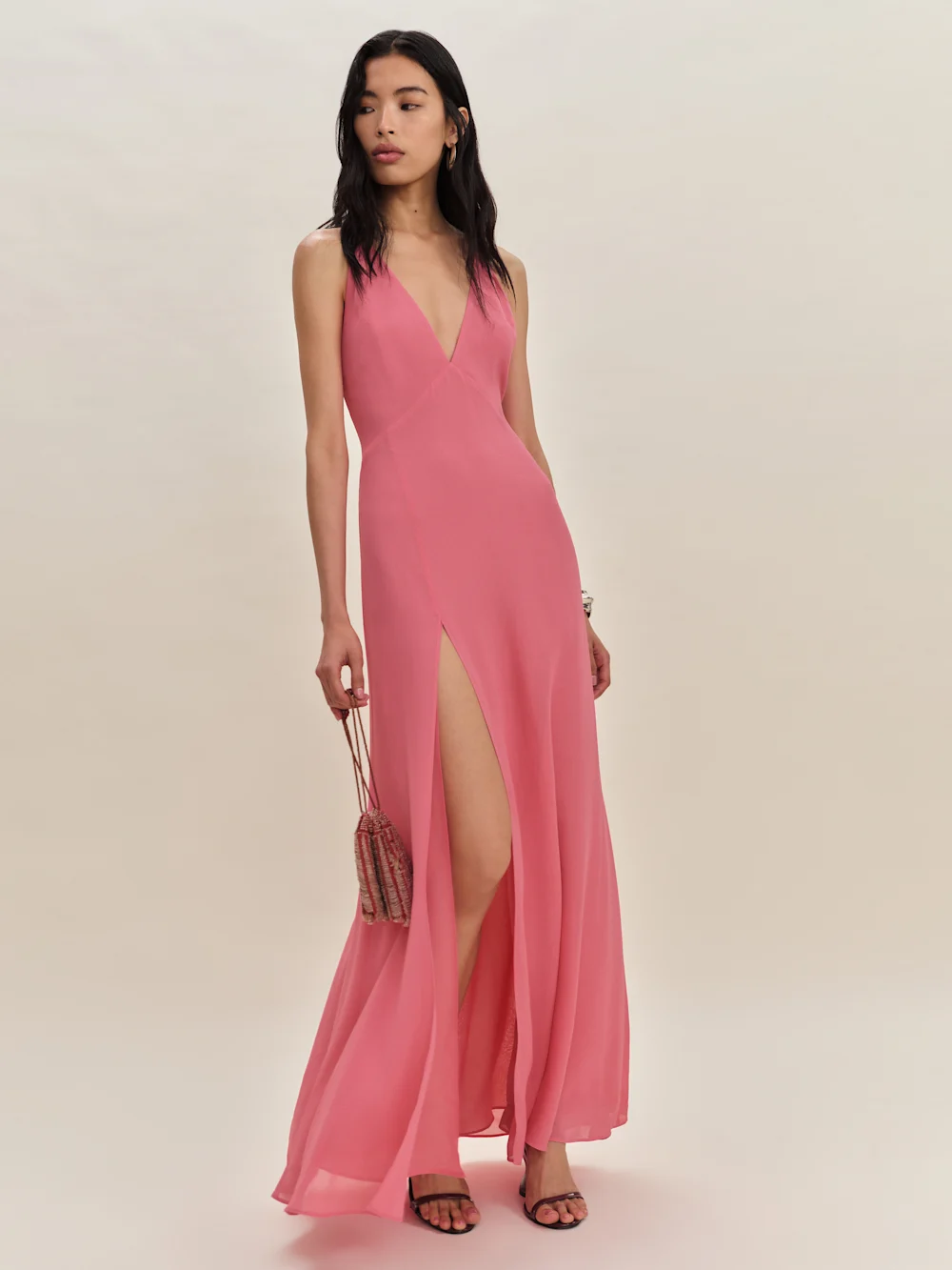 adjustable straps, deep v neck, side slit.