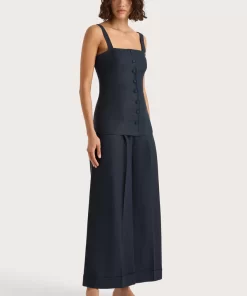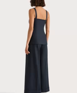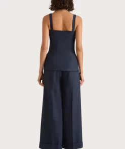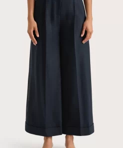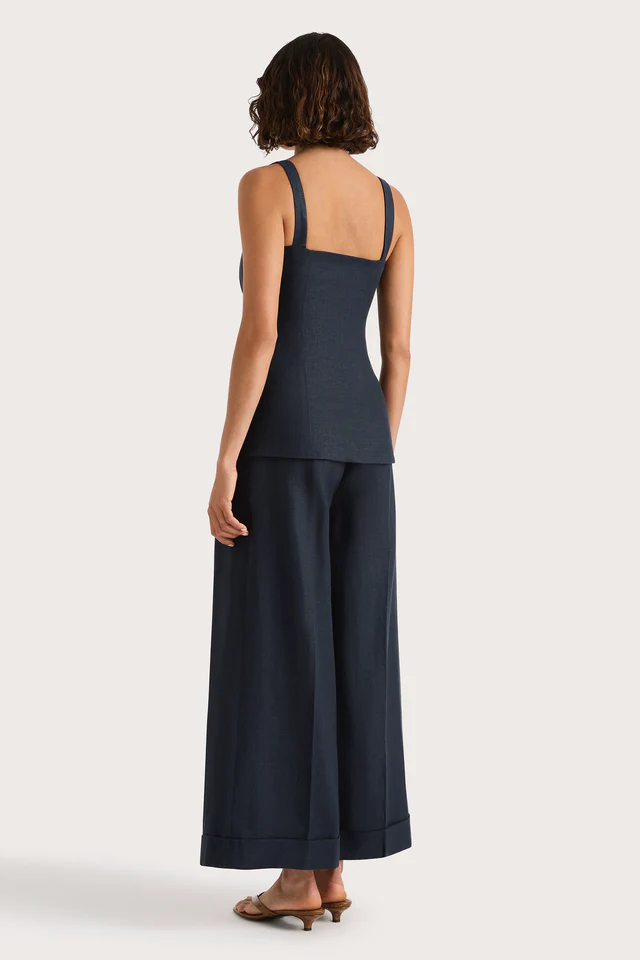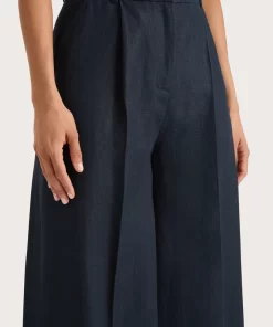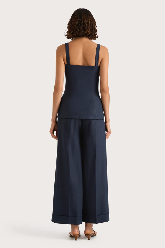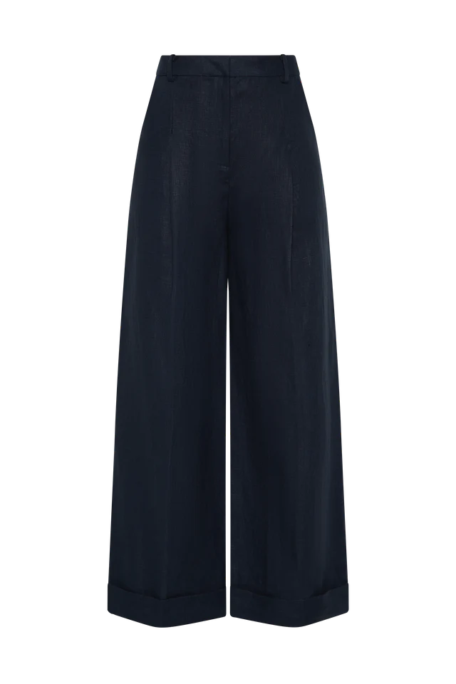A classic mid-rise trouser that sits high on the hips. Designed from a signature 100% European Flax® linen fabrication in a deep navy hue, it features a medium width waistband with belt loops and pleating through the front. It offers a wide, flared leg and crop around the ankles with a cuff detail at the hem. Style with the Corbiere Vest for effortless everyday wear or over swim for beach to bar wear.This style is true to size. Please note there is no elastic woven into the fabric so it does not offer any additional stretch.