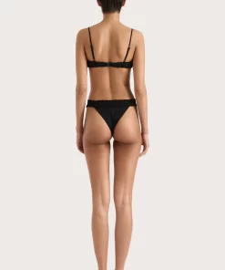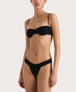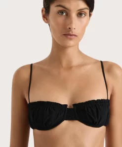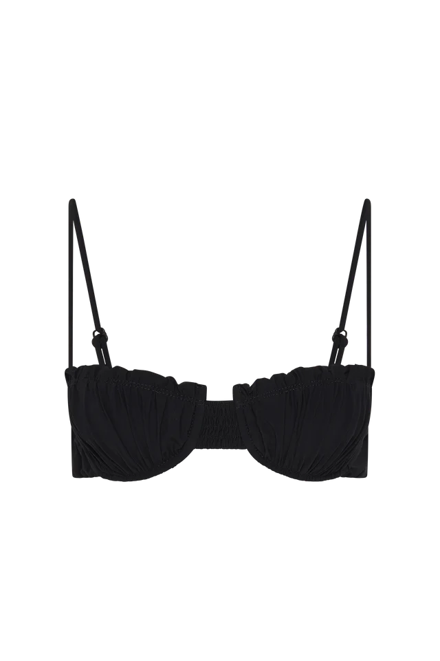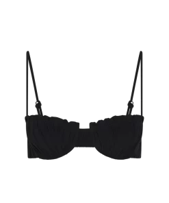 A balconette-style bikini top with thin straps, adjustable in length. Designed in a classic black colourway, it features gathering and pleats through the front and sides, with a feminine frill detail along the top of the bust. Style with the matching Esterel Bikini Bottom for a timeless yet feminine approach to vacation swimwear. This style is true to size and offers medium coverage. Adjustable straps allow for a custom fit, however it is fixed through the back with a clasp.