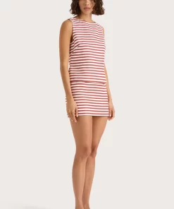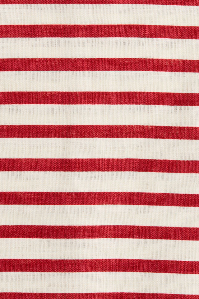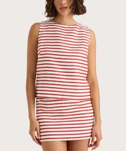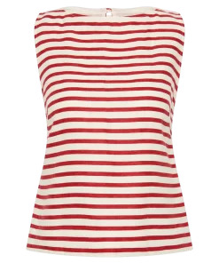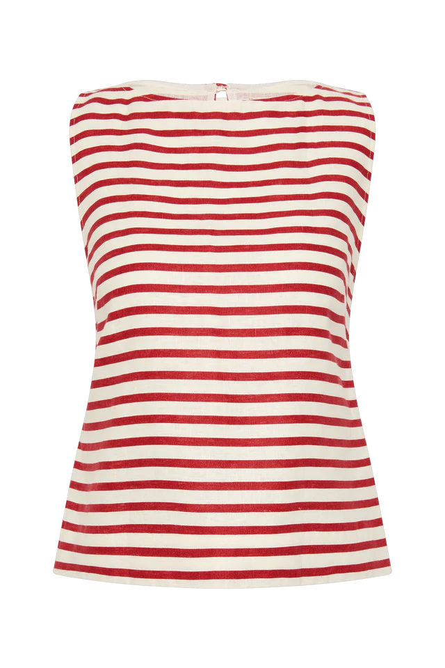 A classic tunic-style top, designed from a 100% European Flax® linen fabrication in a nostalgic red and white stripe. It is sleeveless with a boat-style neckline and a keyhole detail at the back neck. There are back waist ties, adjustable to tie in a knot or a bow, and the crops just at the hips. Style with the Jane Mini Skirt and a simple sandal for elevated everyday wear.This style is true to size. Please note the back ties are adjustable for custom cinching at the waist.