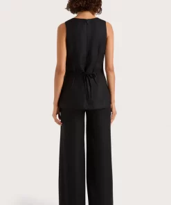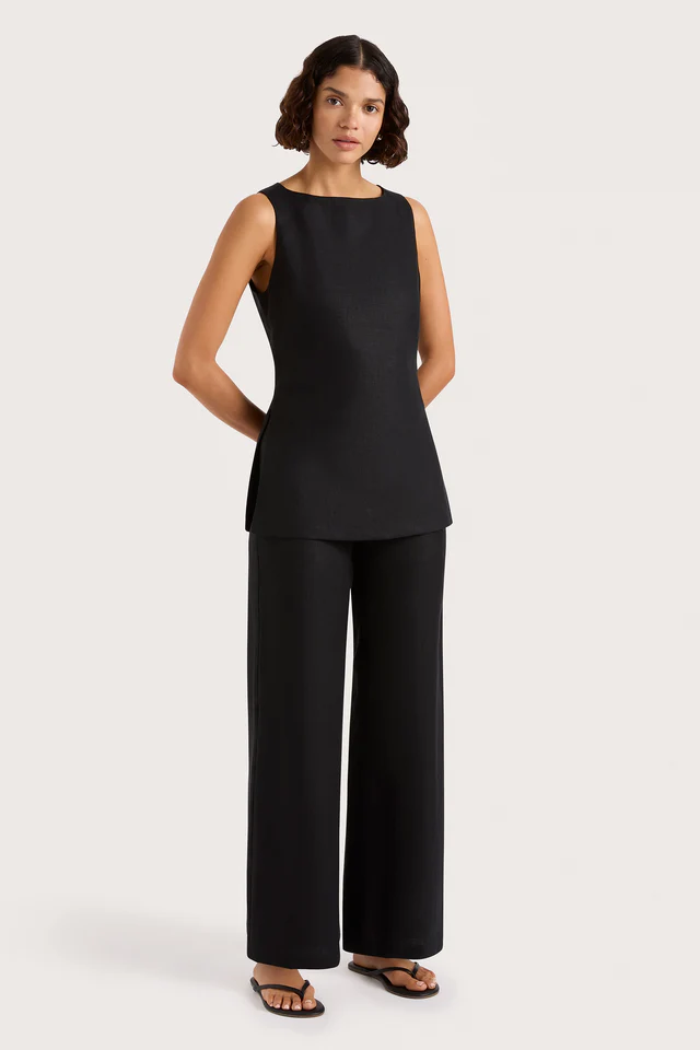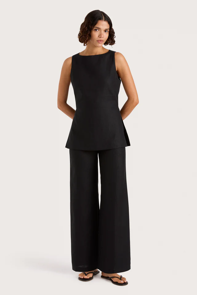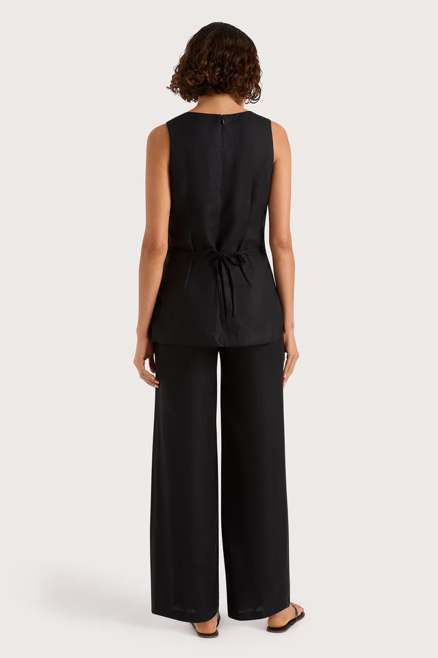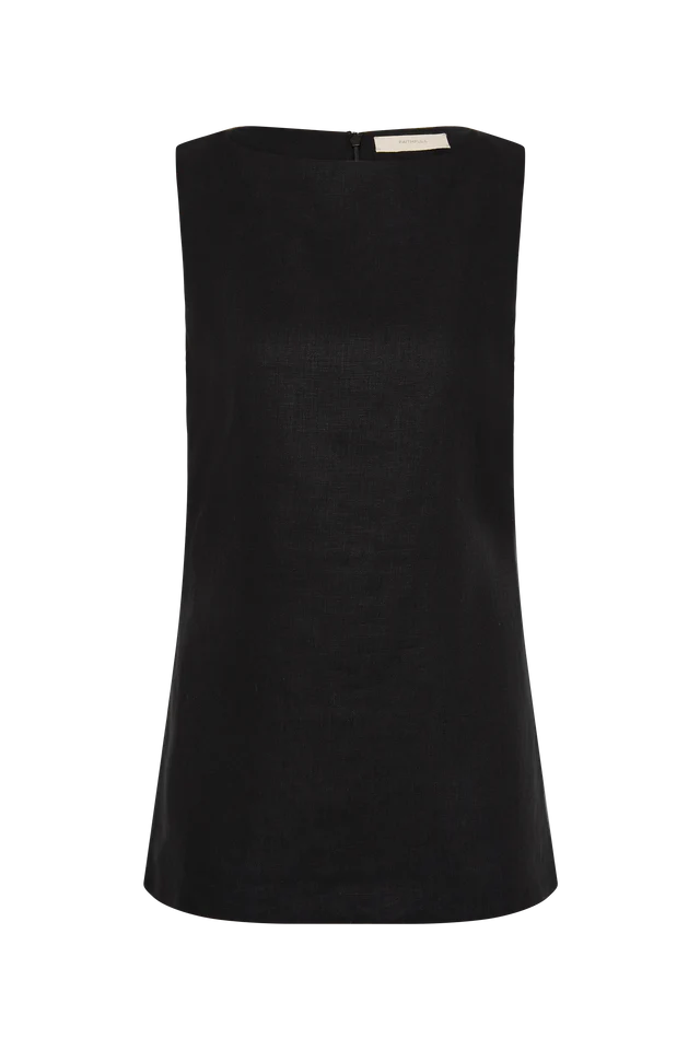 A signature FAITHFULL silhouette, reimagined with new elevated details and designed from a 100% European Flax® linen fabrication. It is a sleeveless tunic-style top with a boat neckline and back tie detail, adjustable to tie in a knot or a bow. Offered in a classic black colourway, it sits comfortably on the body with side splits at the hem. Style over a classic trouser like the Jean Pant for relaxed work to weekend wear. This style is true to size. Please note the back ties are adjustable for custom cinching at the waist.