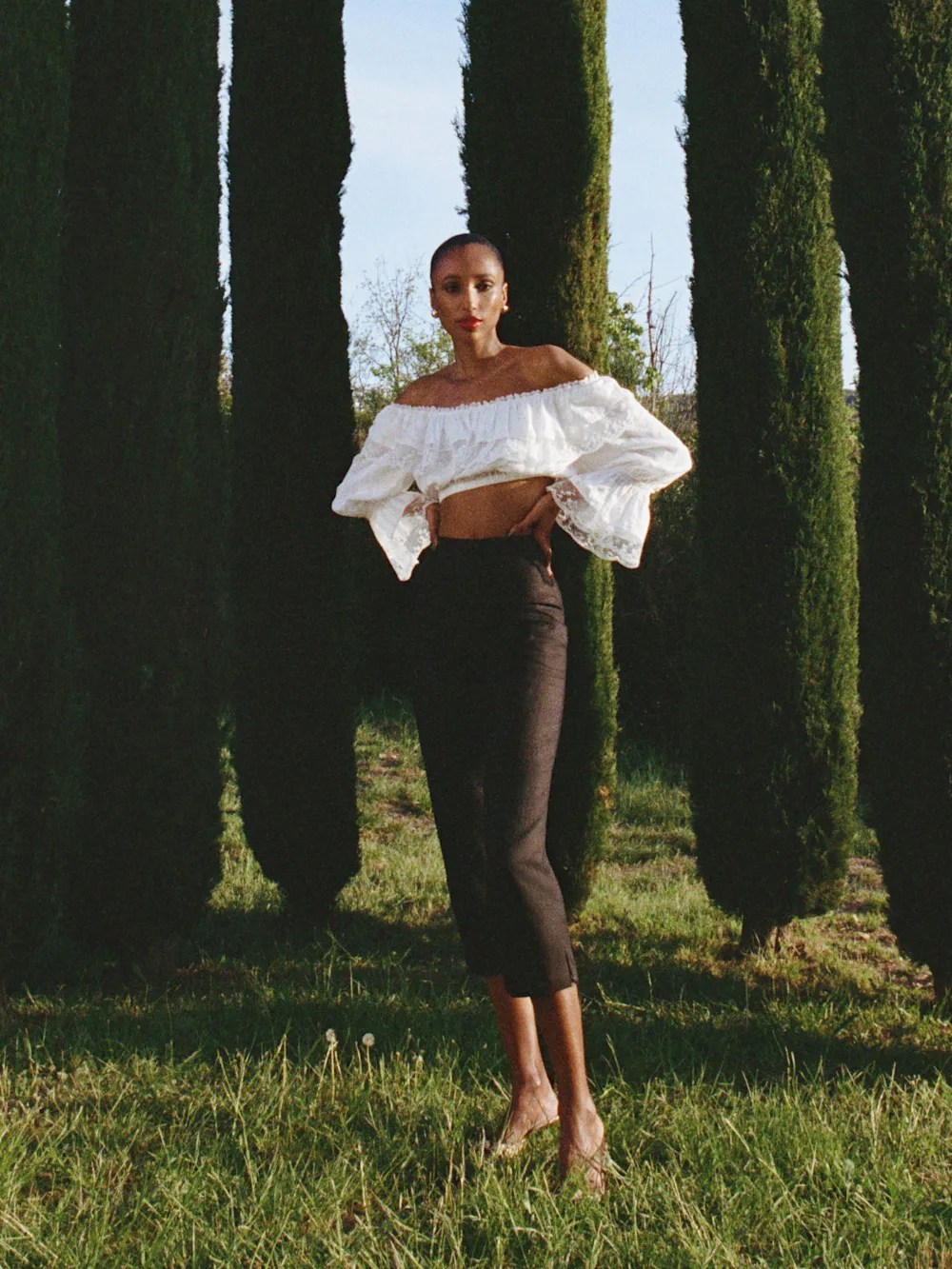 The model is wearing a size 0 and has a 23″ waist, 34″ hips.