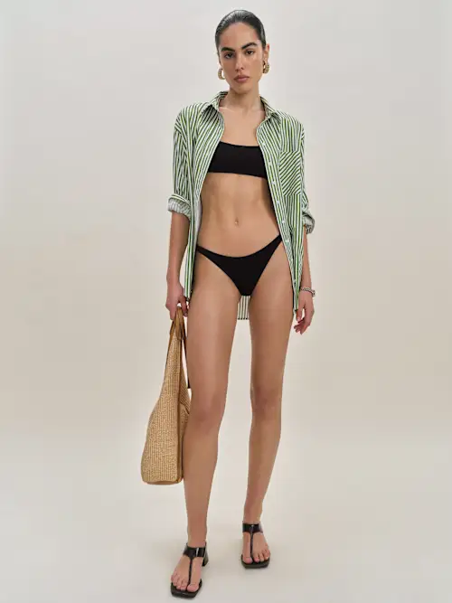 The model is wearing a size XS and is 5′ 9.5″, 24″ waist, 34.5″ hips, 34″ bust.
