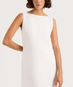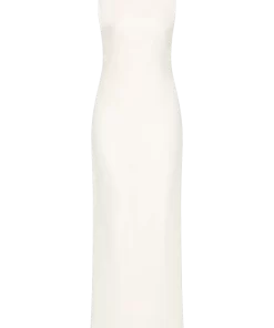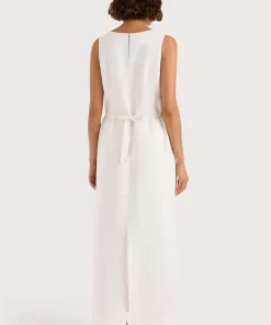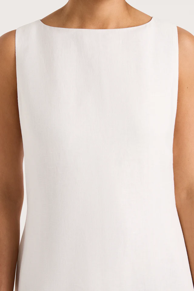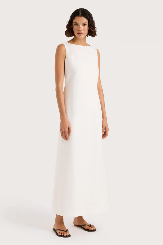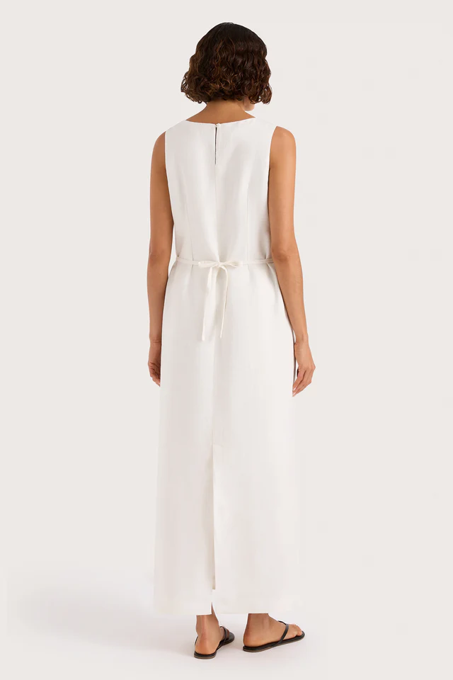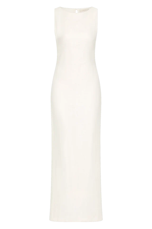 A signature FAITHFULL silhouette, reimagined with new elevated details and designed from a 100% European Flax® linen fabrication. It is a sleeveless maxi dress with a boat-style neckline and back neck keyhole, fitted with a matching button. Softly fitted through the body with a smooth finish, it falls into a slight A-line skirt with a back waist tie for additional cinching. Offered in a creamy white, style with a sandal with effortless vacation wear. This style is true to size. Please note the back ties are adjustable for custom cinching at the waist.