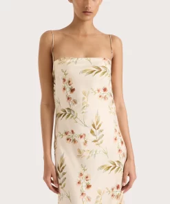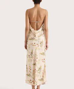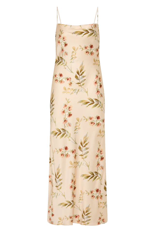 A feminine midi dress with a straight neckline and thin straps, adjustable in length, along with a low cowl back bodice with a thin tie detail. It is a bias cut silhouette with a straight skirt that crops above the ankles. Designed from an ultra soft blend of viscose and rayon, it is offered in a delicate floral motif with warm tones. Style with a simple heel for summer occasionwear. This style is true to size. Please note the straps and back tie detail are adjustable.