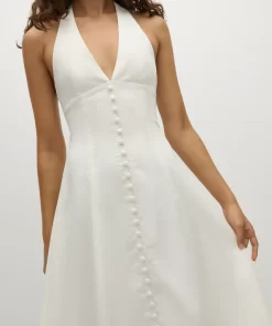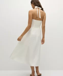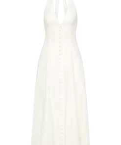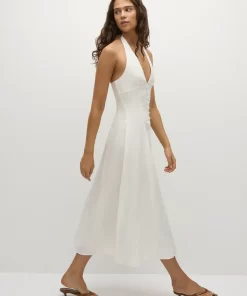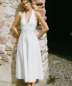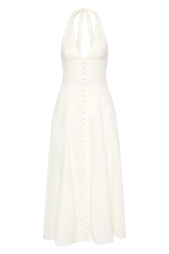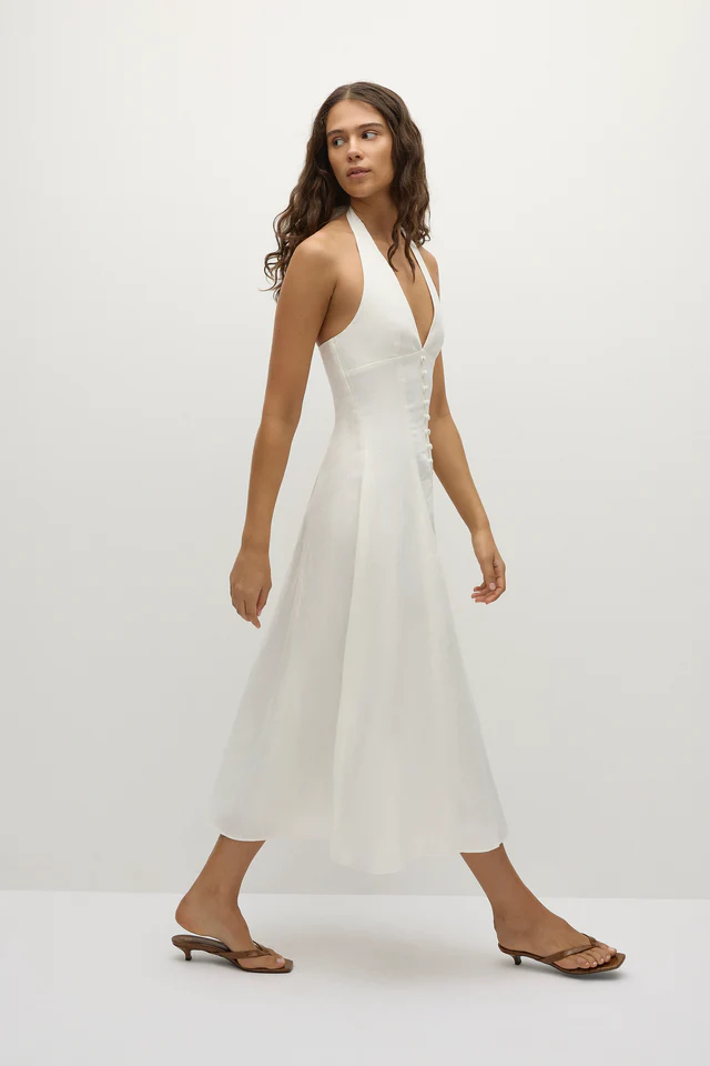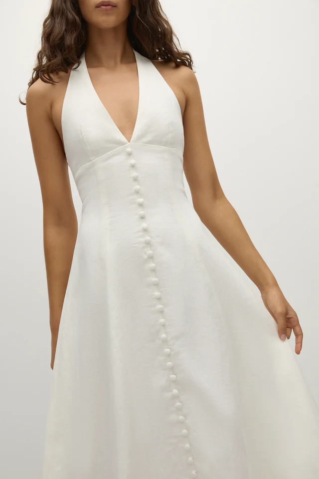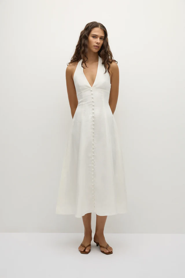 A feminine 1960s-inspired midi dress with a deep V-neckline and tie detail at the back neck. There is subtle stitching under the bust for additional shape and mock button front. It is semi fitted through the bodice before falling into a flared A-line skirt, cropping below the knees. There is a shirred back waist panel which also allows for extra stretch. Designed from a signature 100% European Flax® linen fabrication in a creamy white, style with a sandal or kitten heel for summer occasions. This style is true to size. Please note the shirred back panel offers additional stretch.