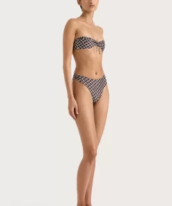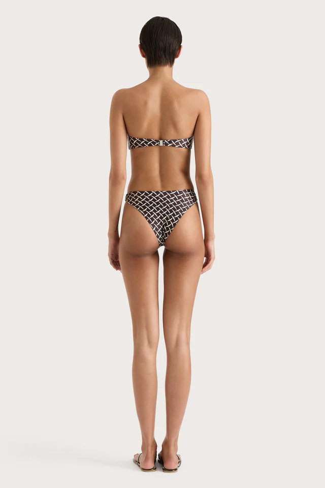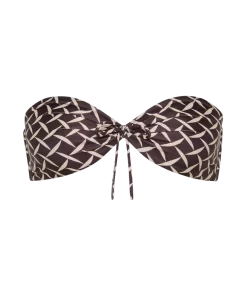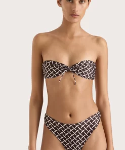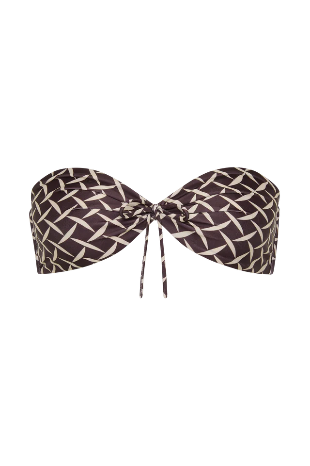 A strapless bikini top in an espresso brown geometric print with a delicate bow detail at the front bodice. There is subtle gathering through the front and a fixed clasp at the centre back. Style with the matching Bandol Bikini Bottom for a retro, yet feminine approach to swimwear. This style is true to size and offers medium coverage. While the fabrication offers some stretch, it is fixed through the back with a clasp.