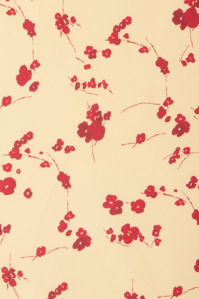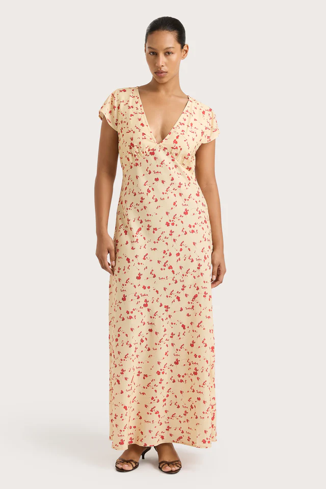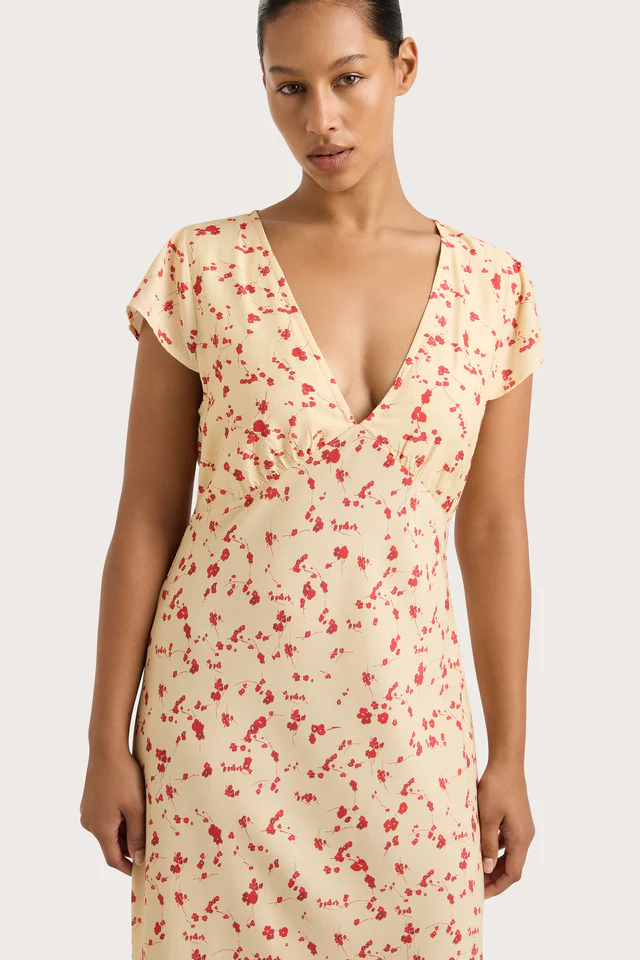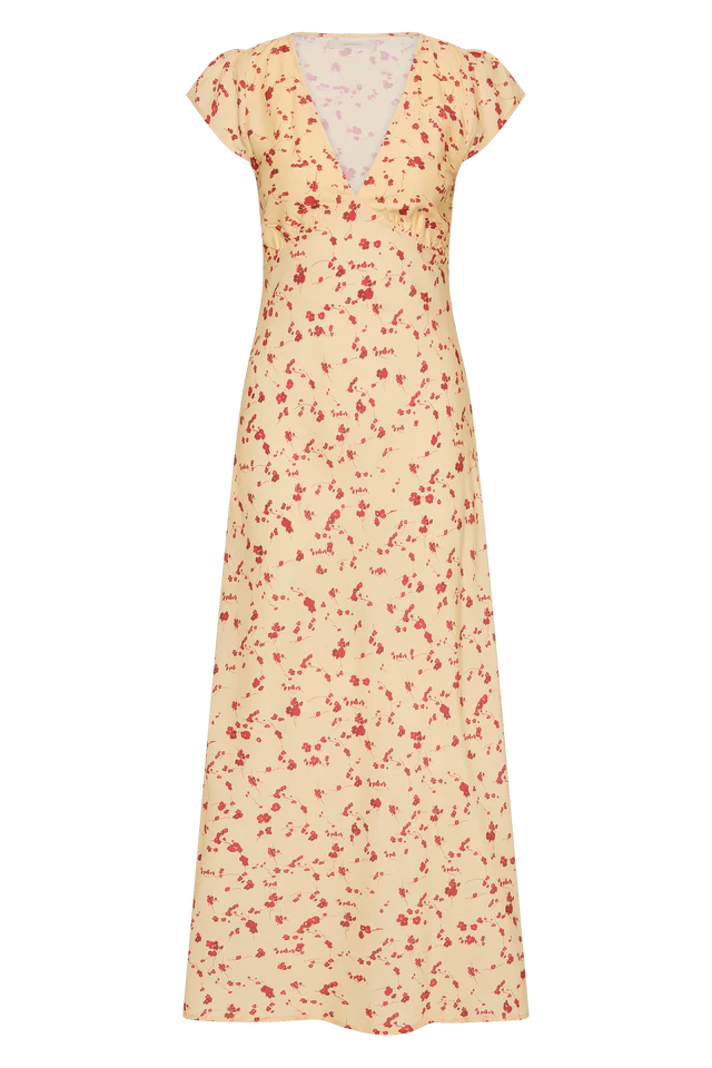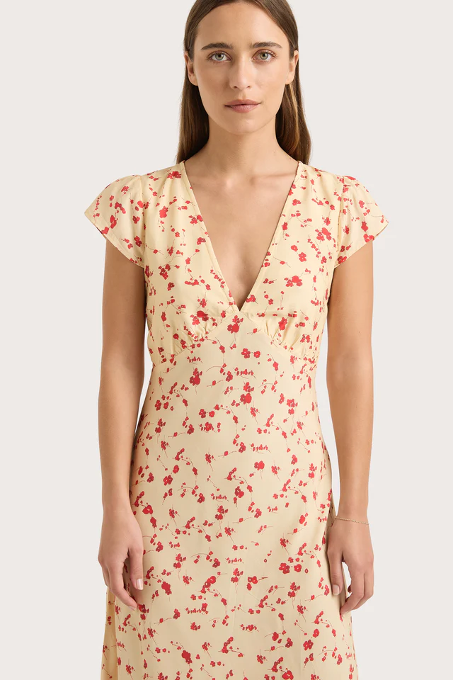A midi dress with a V-neckline and subtle diagonal stitching under the bust. It has short cap sleeves and back waist ties, allowing for custom cinching, before falling into a floating A-line skirt, cropping below the knees. Designed from a soft rayon fabrication in a vintage-inspired yellow floral motif, inspired by blossom flowers, it is both feminine and signature FAITHFULL. Style with a ballet flat for vacation wear. This style is true to size. Please note there is no elastic woven into the fabric so it does not offer any additional stretch. The back waist tie does allow for custom cinching at the waist.