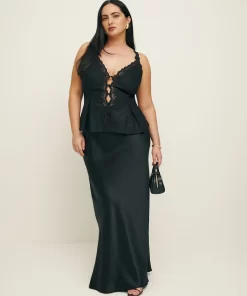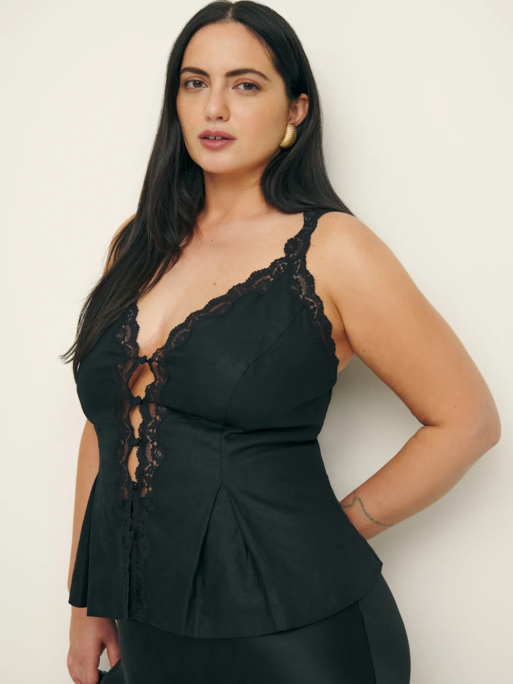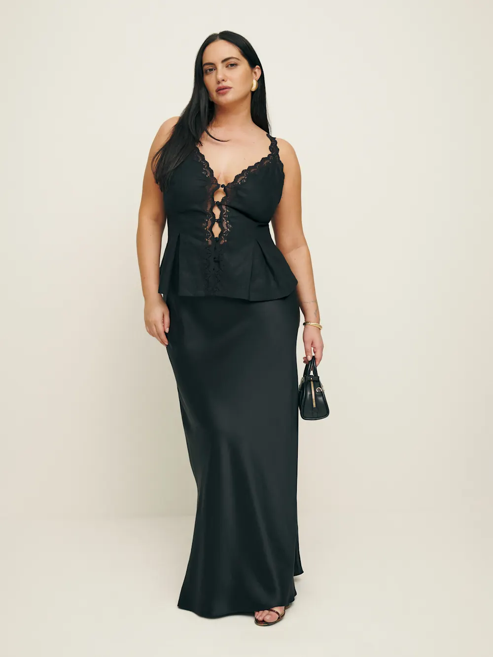 The model is wearing a size 14 and is 5’8″, 33″ waist, 47″ hips, 41″ bust.